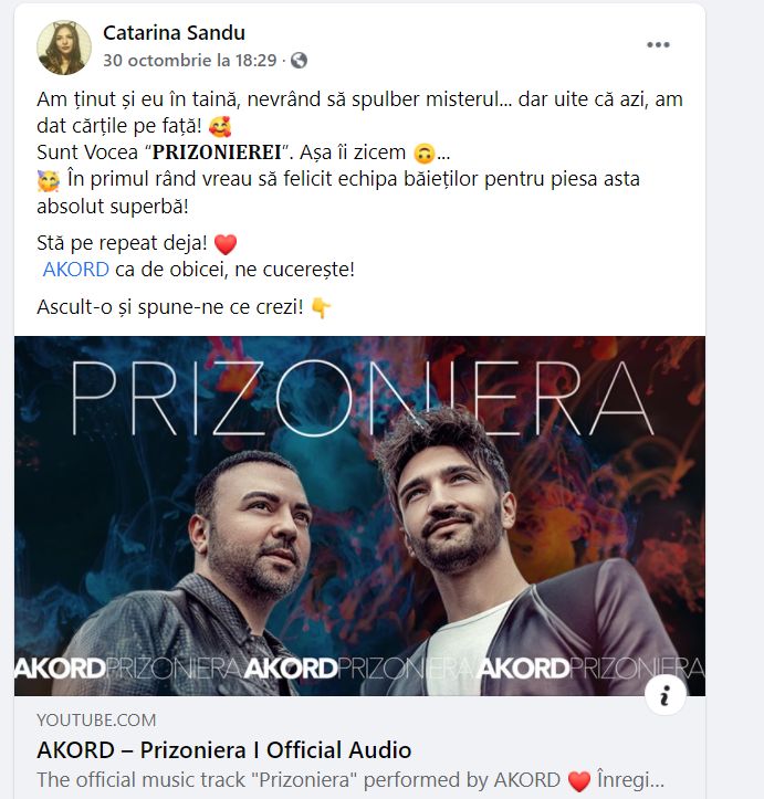 Misterul a fost elucidat si de Catarina. Pe pagina sa de Facebook, artista a facut o publicare, in care a scris: „Am tinut si eu in taina, nevrand sa spulber misterul... dar uite ca azi, am dat cartile pe fata! Sunt Vocea .“