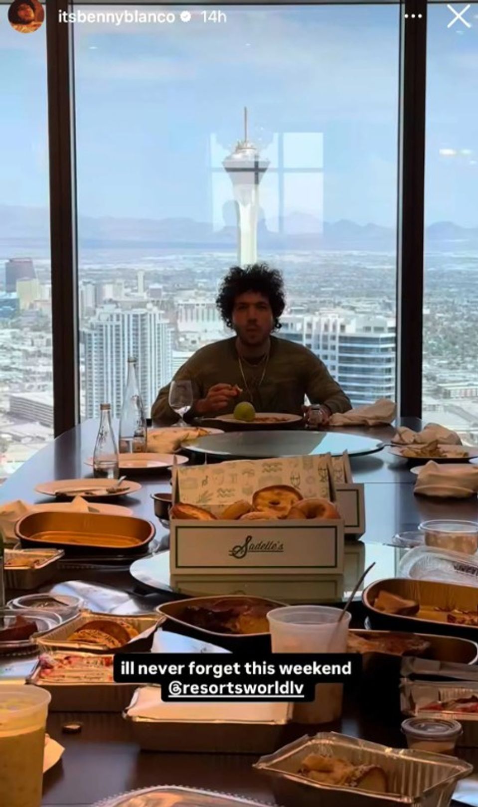 În timp ce Selena Gomez, în vârstă de 33 de ani, își celebra petrecerea burlăcițelor în Mexic, logodnicul ei, Benny Blanco, în vârstă de 37 de ani, se afla în Las Vegas, unde părea să aibă propria petrecere a burlacilor. Acesta a împărtășit câteva momente din această călătorie prin intermediul Instagram Stories. O fotografie îl înfățișa purtând un halat la un centru spa, pe care l-a descris ca fiind „cel mai vindecător loc de pe pământ”. De asemenea, Benny a postat imagini cu el degustând caviar și stând la o masă încărcată cu diverse preparate, printre care și o cutie de covrigi de la Sadelle’s.