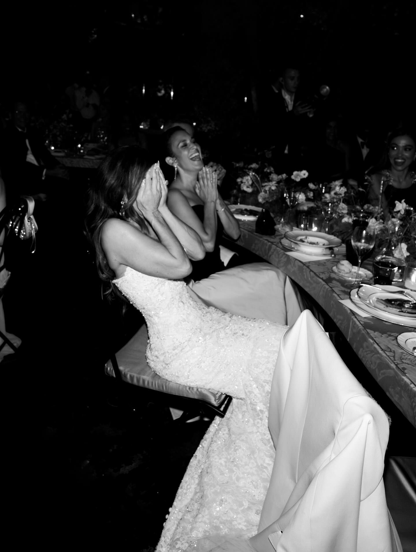 Pe Instagram, Elena a postat duminică două fotografii alb-negru care surprind emoțiile și bucuria momentului. Într-una dintre imagini, Lauren apare zâmbitoare, îmbrățișată de un invitat, iar în cealaltă își acoperă fața râzând, așezată la o masă decorată cu flori rafinate și lumânări elegante.
