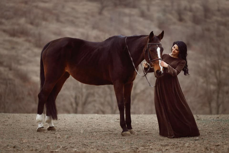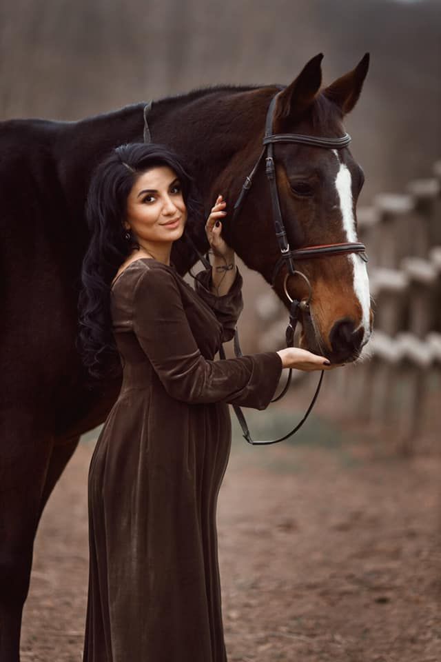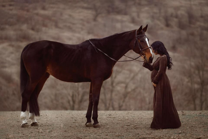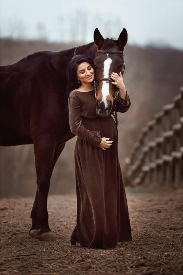 Svetlana a pozat intr-un peisaj autumnal, rustic alaturi de un cal. Nuantele de maro au predominat, iar rochia catifelata i-a pus in valoarea burtica de graviduta care se rotunjeste frumos.