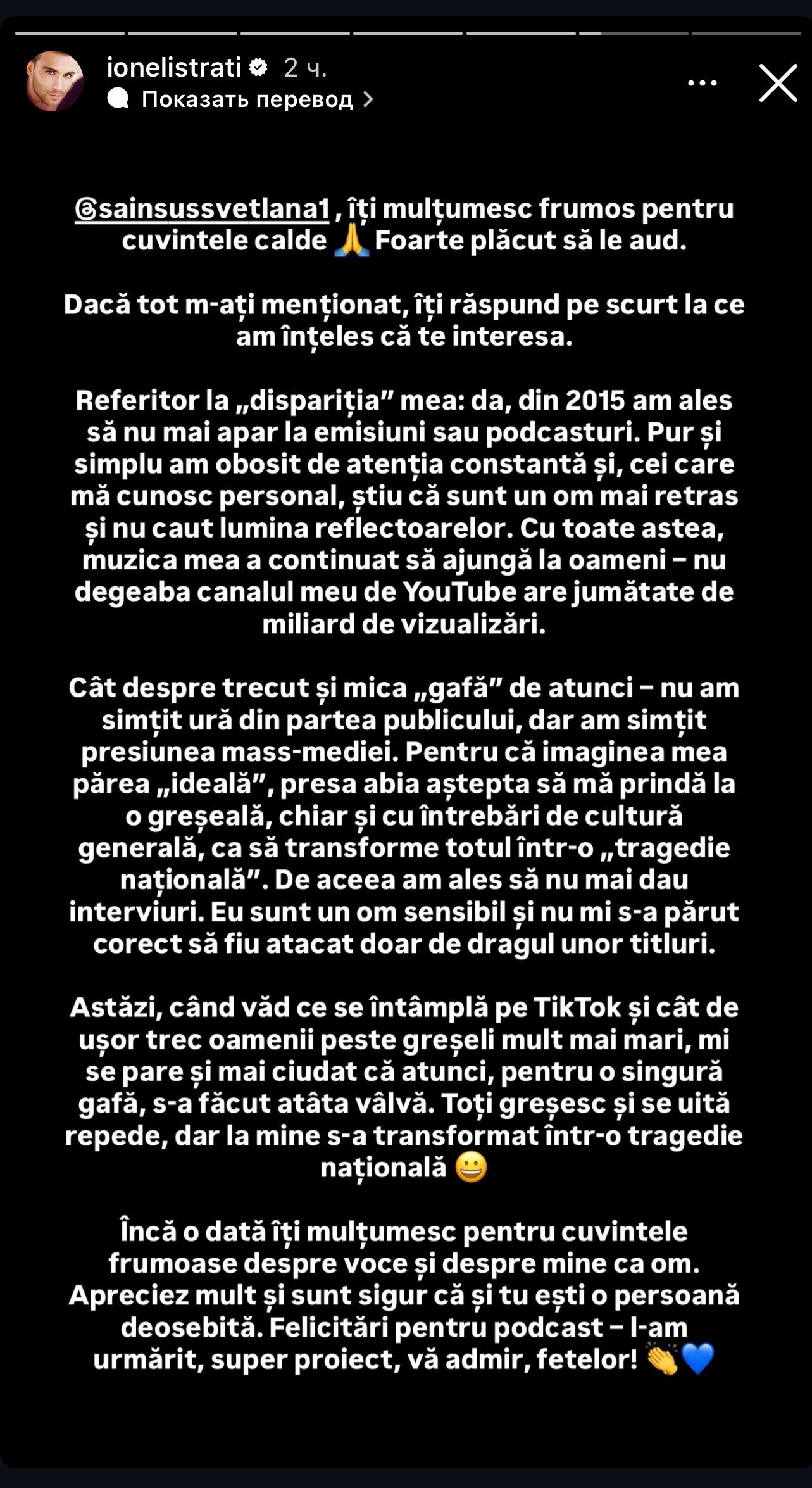 Declarația ei a stârnit multe reacții în mediul online, iar artistul nu a rămas indiferent. La scurt timp, Ionel Istrati a publicat un story, în care i-a mulțumit Svetlanei pentru aprecieri și a oferit explicații legate de „dispariția” sa din showbiz.