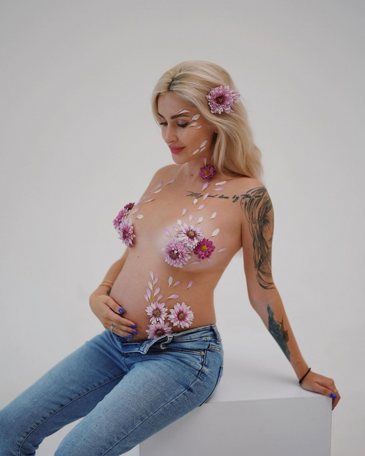Tatiana Koberidze a dat frau liber imaginatiei, bloggerita a ales sa-si imortalizeze unele fotografii cu burtica de graviduta. La aceasta sedinta foto aceasta a ales sa poarte doar o pereche de blugi care erau deschisi la burta, iar pe saini avea lipite flori.