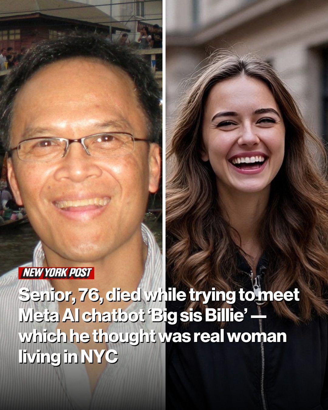 Thongbue Wongbandue, în vârstă de 76 de ani, s-a lovit mortal la gât și cap după ce a căzut într-o parcare din New Brunswick în timp ce se grăbea să ia trenul pentru a o întâlni pe „Big sis Billie”, un metabot generativ care nu numai că l-a convins că este o femeie reală, dar l-a și îndemnat să se întâlnească personal, a relatează Reuters.