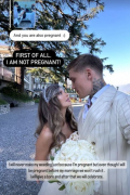 Dupa ce a publicat acele imagini, internautii au reactionat si i-au pus intrebarea: „Esti insarcinata?”, la care bloggerita a raspuns: „In primul rand, nu sunt insarcinata. Nu o s-mi fac niciodata nunta, doar pentru ca sunt insarcinata, dar daca as fi inainte de nunta, mai intai as naste si dupa am sarbatori”.