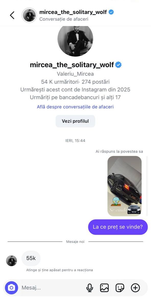 Întrebat care este prețul cerut, Mircea a scris: „55k”.