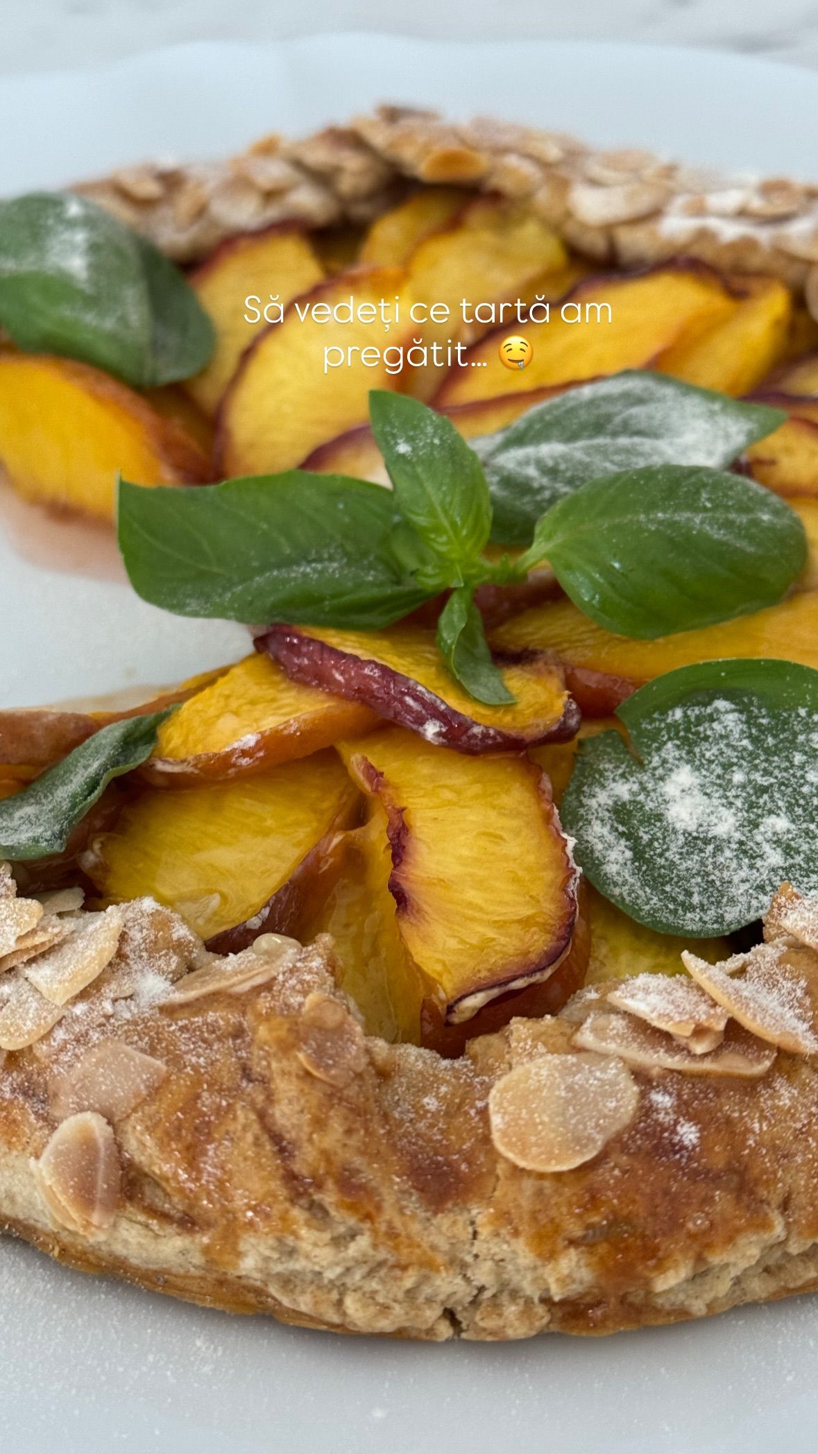 „Iar la final… secretul meu - ung piersicile cu puțină miere. Iar pentru că am avut și miere pudră, am decorat frumos cu câteva frunze de busuioc, peste care am presărat și puțin praf dulce”, a notat nutriționista.