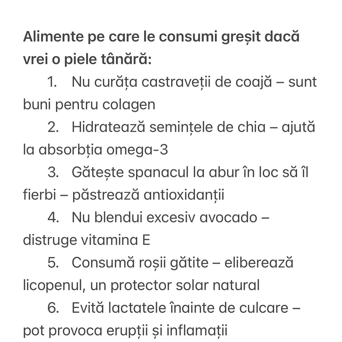 Nutriționista Diana Mereuță a publicat pe Instagram o serie de recomandări, afirmând că îmbătrânim în dependență de ce mâncăm. Iată alimentele pe care le consumi greșit dacă vrei să ai o piele tânără: