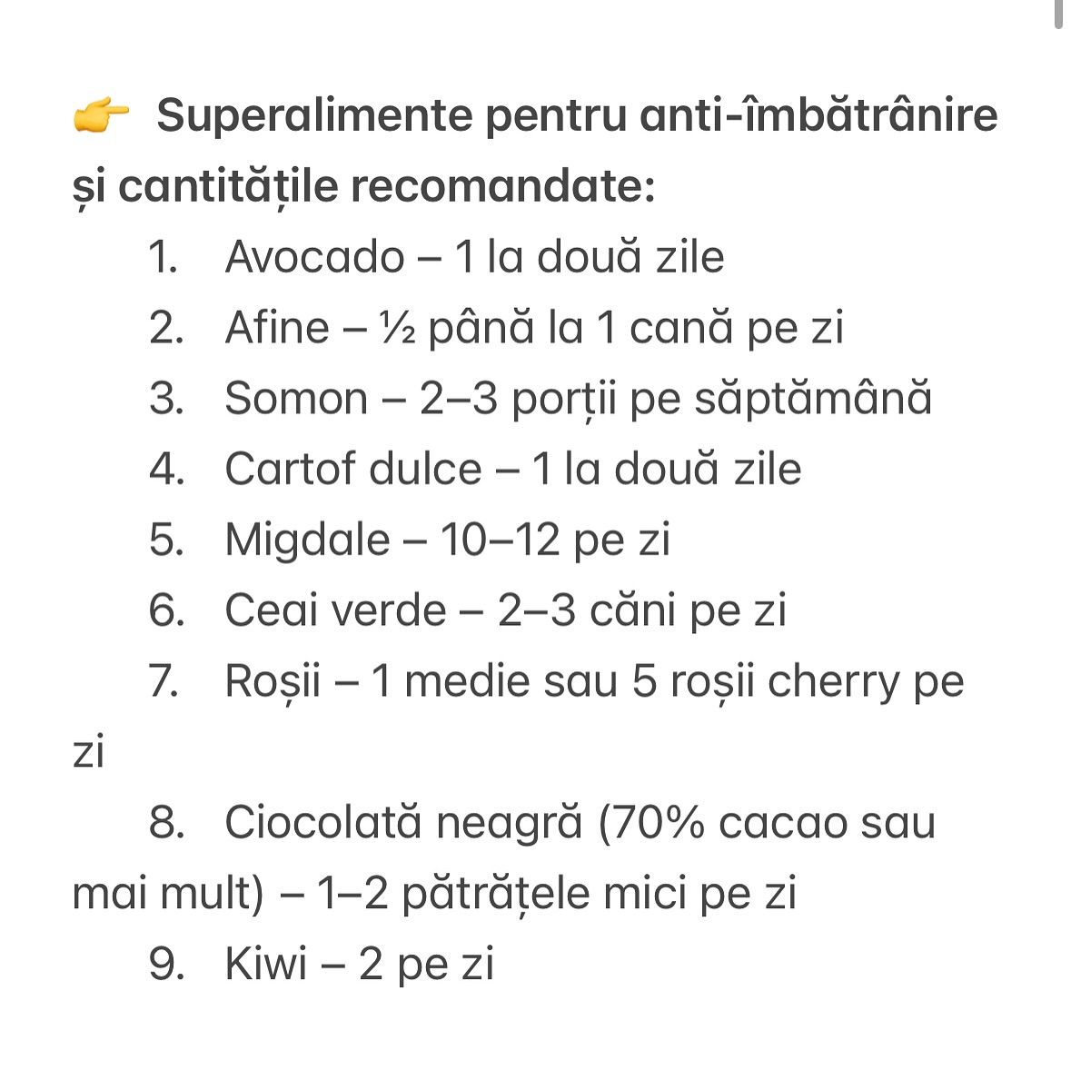 „Roșii, kiwi, somon, afine, avocado, spanac, nuci, ceai verde, cartofi dulci, rodii, ciocolată neagră de minim 72%”.