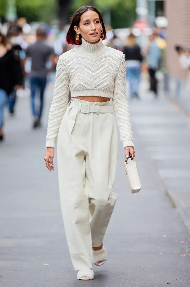 Aceasta combinatie va face silueta si mai slaba si mai expresiva. Un pulover decupat accentueaza talia, in timp ce pantalonii cu talie inalta alungesc picioarele.