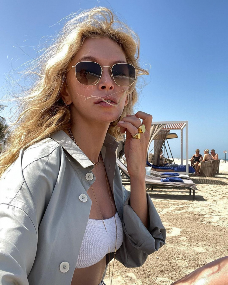 Si bineinteles ca ochelarii de soare nu lipsesc din outfiturile de zi cu zi ale artistei, iar pe plaja adora costumele de baie cat mai simple.