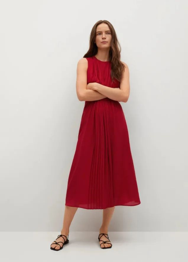 O rochie midi plisata, intr-o culoare suculenta de capsuni poate fi cea mai reusita achizitie a sezonului. Arata bine atat cu accesorii si incaltaminte mai aprinsa de culoare cat si cu accesorii de culori mai neutre.