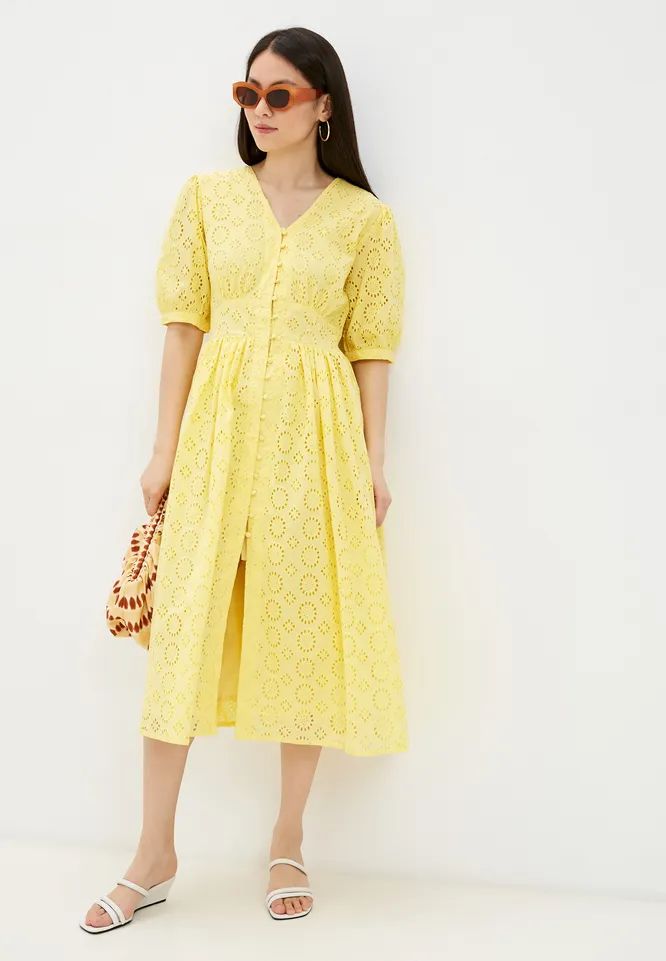 O rochie ajurata de cea mai la moda culoare a verii - galbena - va fi excelenta pentru un aspect festiv. Completati-o cu sandale minimaliste intr-o culoare indrazneata (cum ar fi roz), o geanta mica si cercei cu perle.